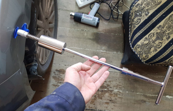 При ударах вся конструкция движется по инерции от поврежденного места и одновременно вытягивает деформированный металл в исходное состояние.