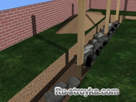 2. В первую очередь на дно траншеи распределите большие валуны. Валуны укладываются в 2-3 ряда, в зависимости от конструкции. |