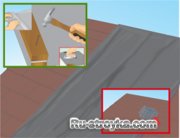5. Возьмите другой брусок и уложите его поверх обтянутого бруска брезентом, после чего закрепите его при помощи больших гвоздей к самой крыше. Закреплять бруски нужно по краю карниза крыши. |